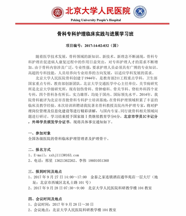 北京大学人民医院骨科创建于1944年,是教育部211工程重点学科,卫生部国家重点专科,教育部创新团队,北京大学交通医学中心主任单位,关节病研究所是北京大学级研究所,现有创伤骨科、骨肿瘤科、骨关节科、脊柱外科四个亚专科,四个骨科各有所长,实力雄厚,均处于国内、国际领先水平。2014年,我院骨科被评为北京市首批骨科专科护士培训基地,在骨科护理领域积累了丰富的临床及教学经验。本次培训班聘请我院著名骨科教授及院内外护理专家,将对护理岗位管理及信息化建设等进行精彩讲解,与国内专家、同行就骨科相关领域问题进行研讨。学习结束授予国家级Ⅰ类继续教育学分6分,北京市学员IC卡记分,外埠学员颁发学分证书。现将具体事宜通知如下: