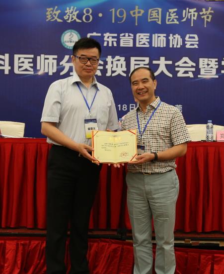▲广东省医师协会黄俊强秘书长向第二届委员会主任委员盛璞义教授颁发聘书