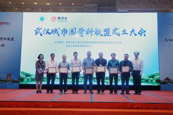 会上 ,联盟主席杨述华教授与骨卫士总裁助理刘小乡主任为武汉城市圈骨科联盟进行了荣誉揭牌。夏仁云教授、刘世清教授、陈庄洪教授、张功礼教授、崔文一女士共同参与见证了揭牌仪式。